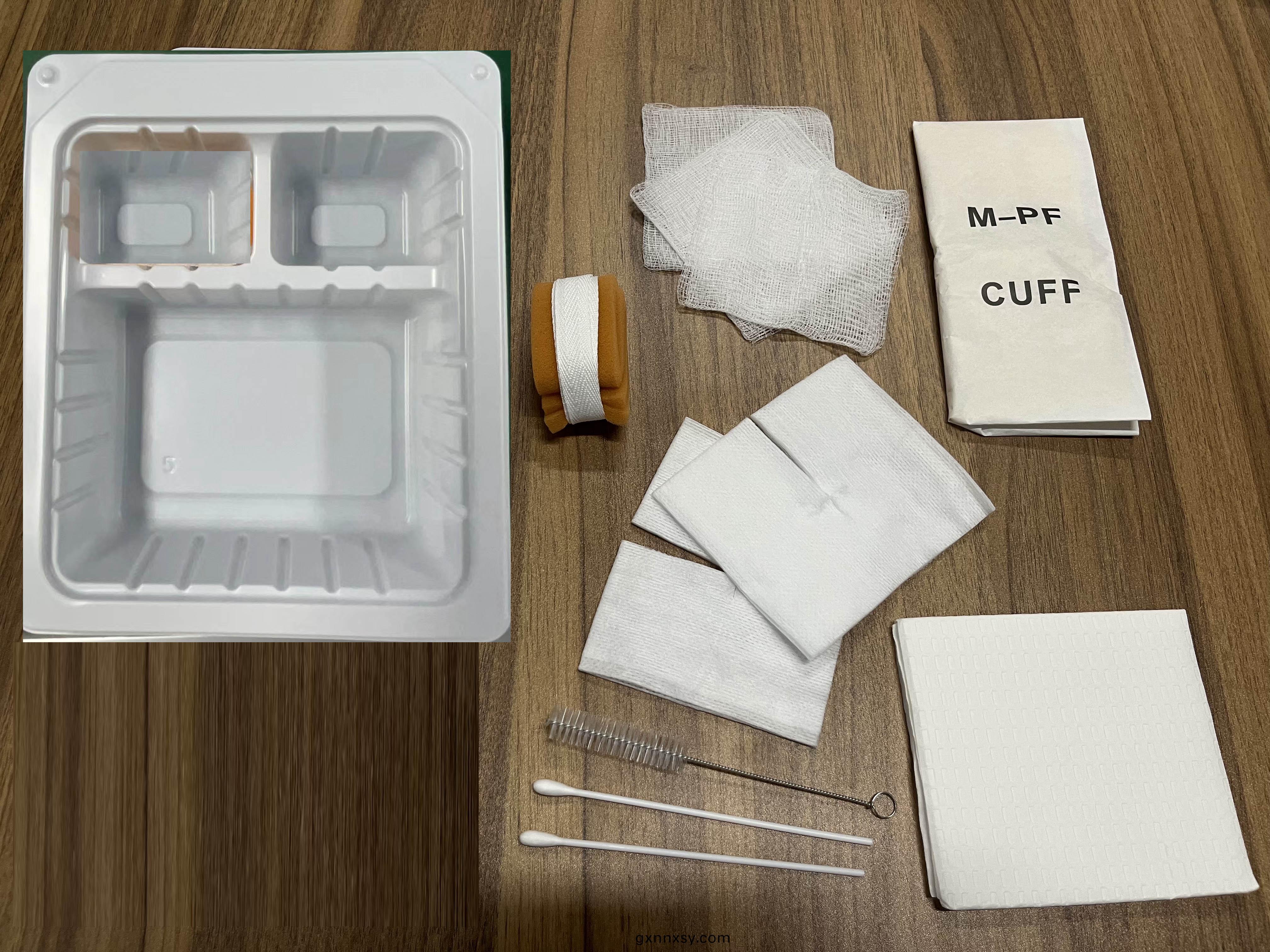 主(zhu)要(yao)材質 - a. One (1) plastic tray with three compartments. b. One (1) pair of gloves. c. Two (2) Pre-cut tracheostomy dressing.